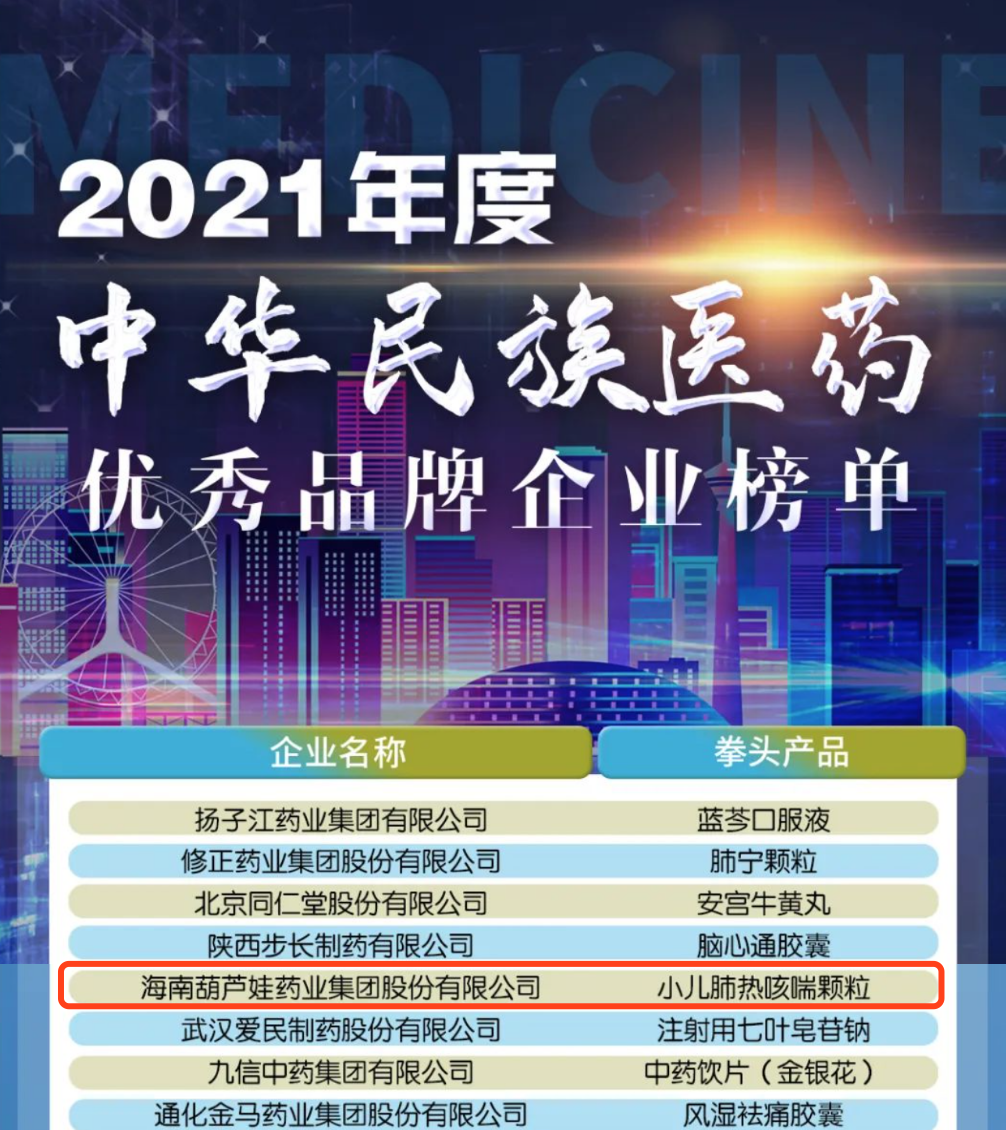 12月29日,全国工商联医药业商会发布了“2021年度中华民族医药优秀品牌企业榜单”,AG庄闲药业集团凭借黄金单品小儿肺热咳喘颗粒(4克)实力登榜。